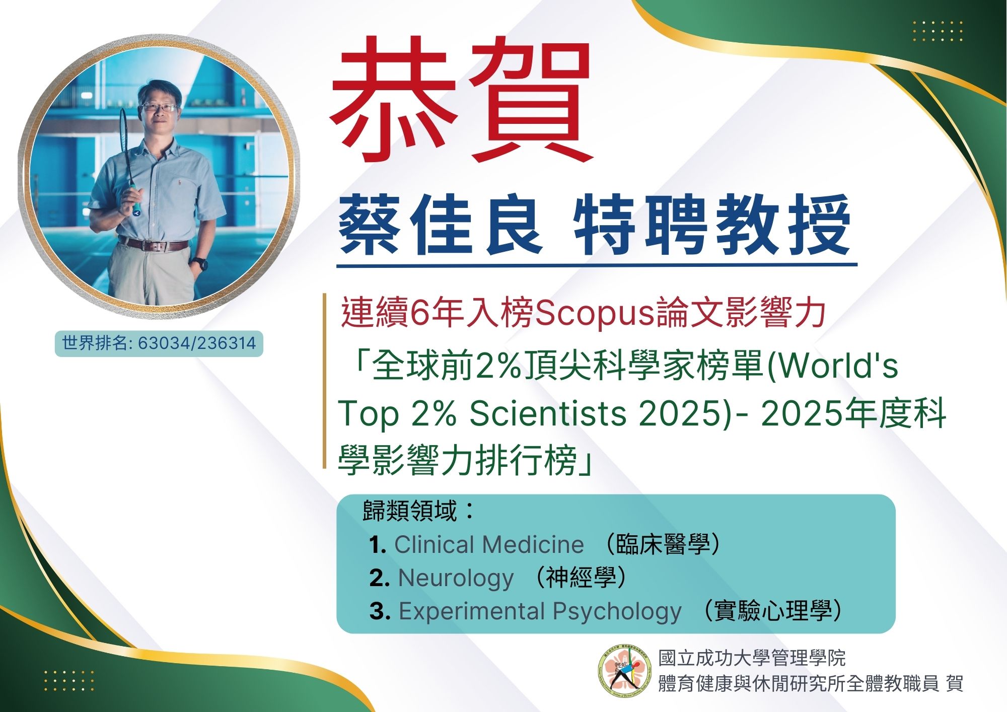 🎉賀!蔡佳良特聘教授連續6年榮登全球前2%頂尖科學家名單🎉